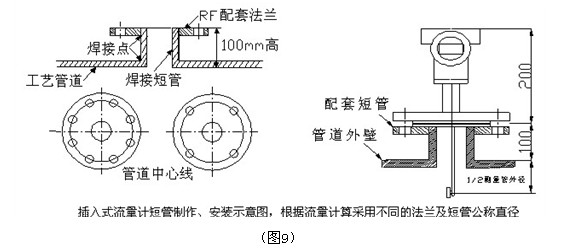 h、插入式樱桃视频大全安装时,将短管及法兰焊到管道上时必须确保流体正对着靶片受力面,焊接短管高度在100mm(从管道内壁至法兰密封面的距离);(图9)